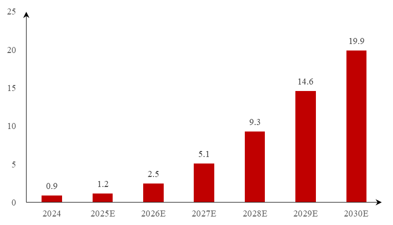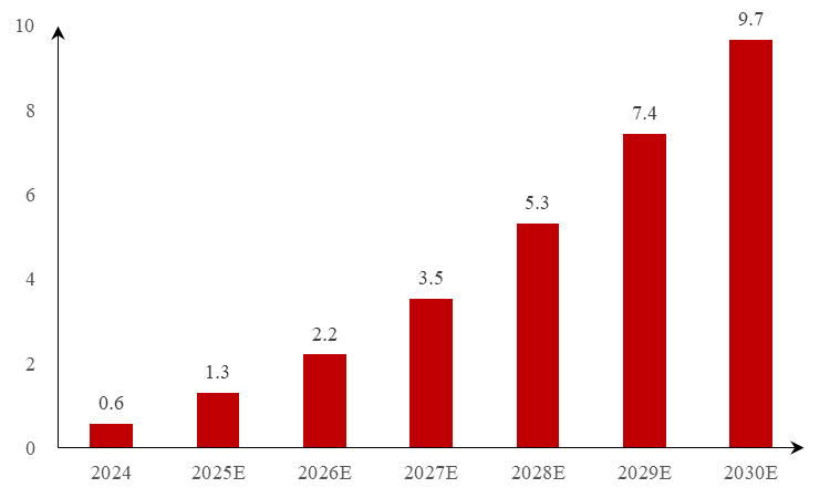 单晶炉的发展和升级较为频繁,在水冷增强、拉速提升、智能化程度等方面不断进行迭代升级。晶盛机电的磁拉单晶炉及联创超导磁拉单晶用高温超导磁体已经进入小批量供货阶段,2025年将完成设备的大规模交付,市场整体将进入设备换代期。根据赛迪数据,2024年全球用于磁控直拉单晶炉的高温超材料规模为0.6亿元,预计2030年将增长至9.7亿元,2024至2030年间的复合增长率为60.2%。