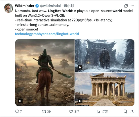 随后开源的世界模型LingBot-World以媲美Google Genie 3的性能,让网友直呼“哇塞”:16帧/秒的实时交互模拟,延迟低于1秒,拥有长达1分钟的上下文记忆能力,关键还是开源的,“已经找不到词形容了,只能说太惊艳了。”