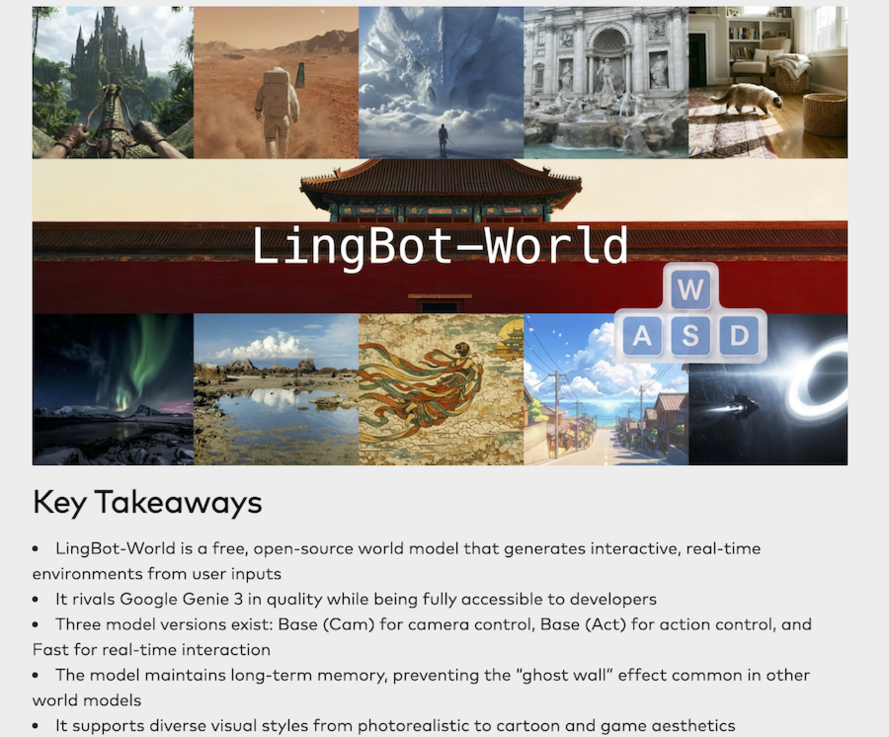 AI技术评测网站Gaga.art在报道中指出,LingBot-World作为一个免费、开源的世界模型,可以根据用户输入生成交互式实时环境,模型生成的质量与Google Genie 3相当,同时完全面向开发者开放。