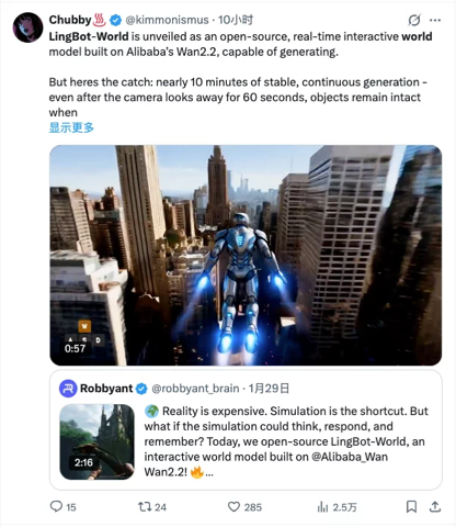 网友Chubby指出,LingBot-World真正的亮点在于能实现近10分钟的稳定、连续生成,哪怕镜头移开60秒,当镜头再次返回时,场景中的物体依然保持完整。
