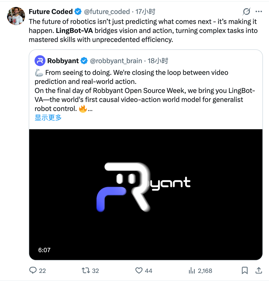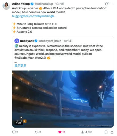 Hugging Face CTO 助理 Adina Yakup 也点赞转推:“蚂蚁集团在具身领域模型正火力全开,在推出VLA和空间感知基础模型后,又带来了一款全新的世界模型!”