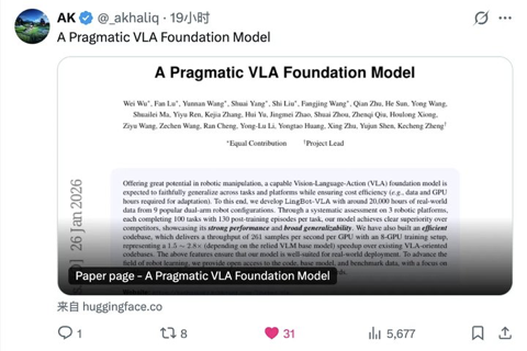 第二天的具身VLA基座模型获大模型学术领域意见领袖AK推荐,在学术圈激起广泛讨论。