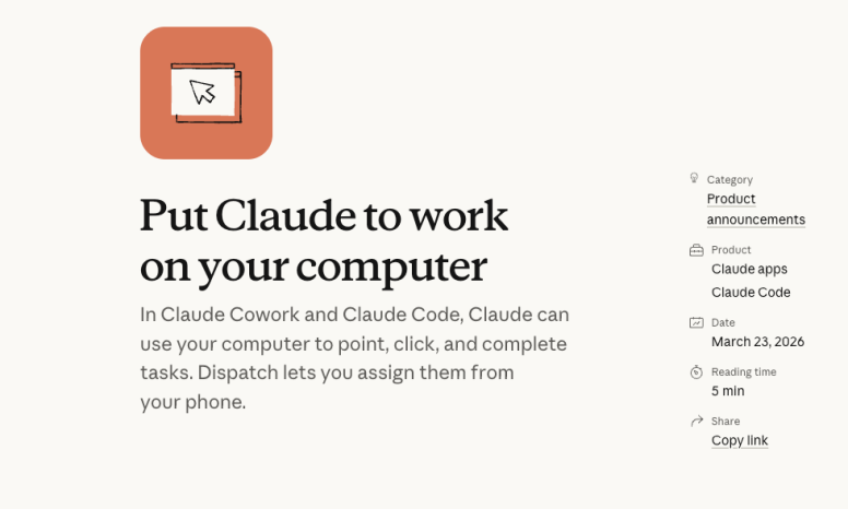 当地时间3月23日,Anthropic在官方博客宣布为Claude发布了计算机操作(computer use)功能,Claude可以利用电脑进行点击操作并完成任务。搭配上周发布的Dispatch功能,用户可以在手机上为其分配任务,自主干活。