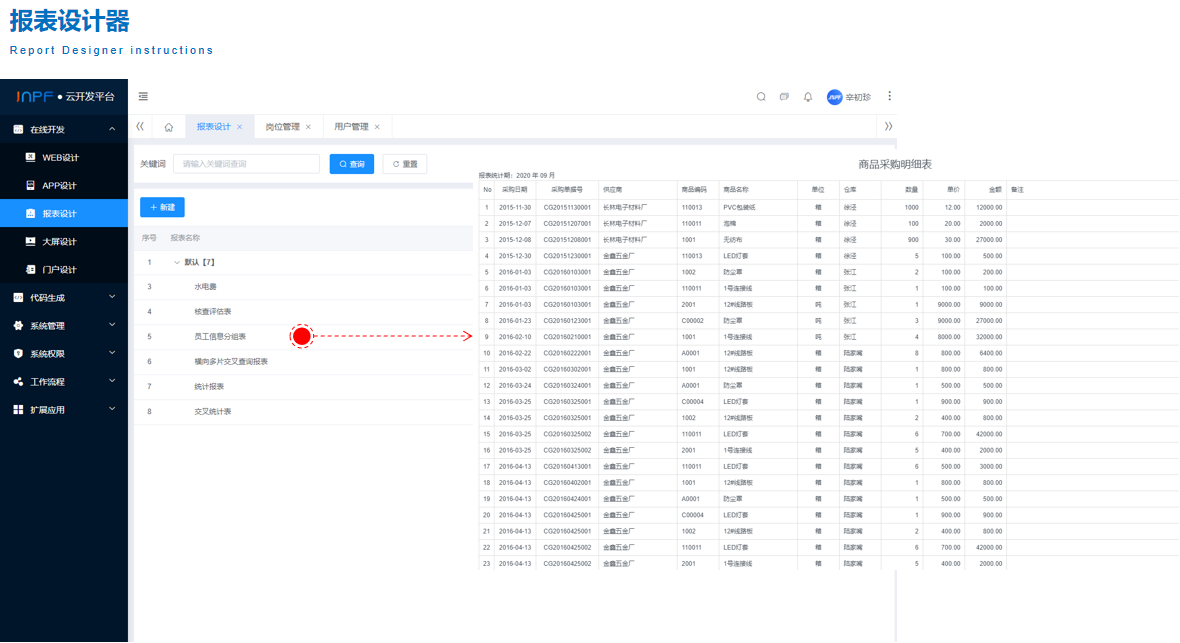 消除平台对代码编程人员的依赖,根据企业数据和业务管理需求,通过组件拖拽等可视化方式设计并完成页面内容,所见即所得。