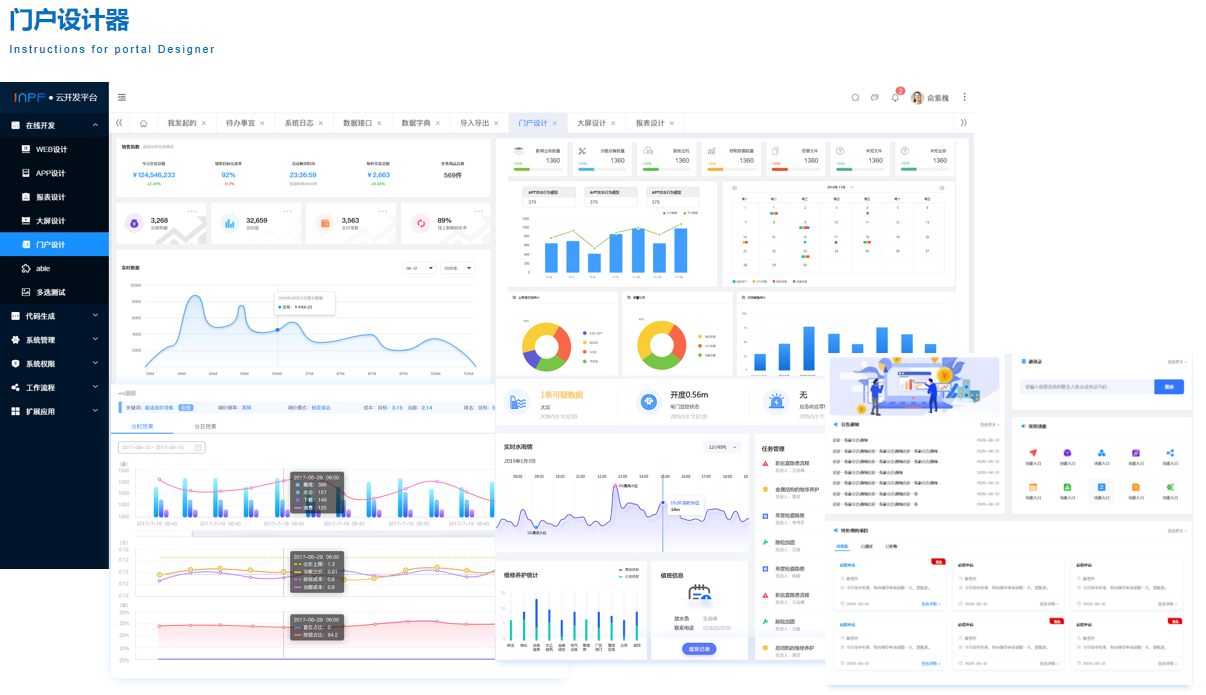 JNPF的门户设计器提供了多样式的预定义门户风格,用户可以自由的将组件拖拽到画布上进行配置和布局,通过简单的拖动和设置,设计个性化的门户页面。