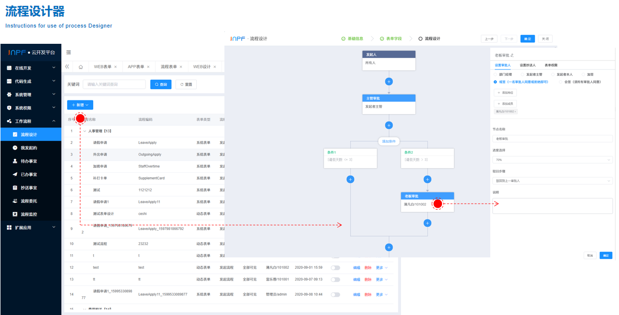 流程设计器集成了自由表单设计器,流程引擎,并支持线性流程、父子流程、同步分合流、异步分合流程,全部实现可视化设计,所见即所得。