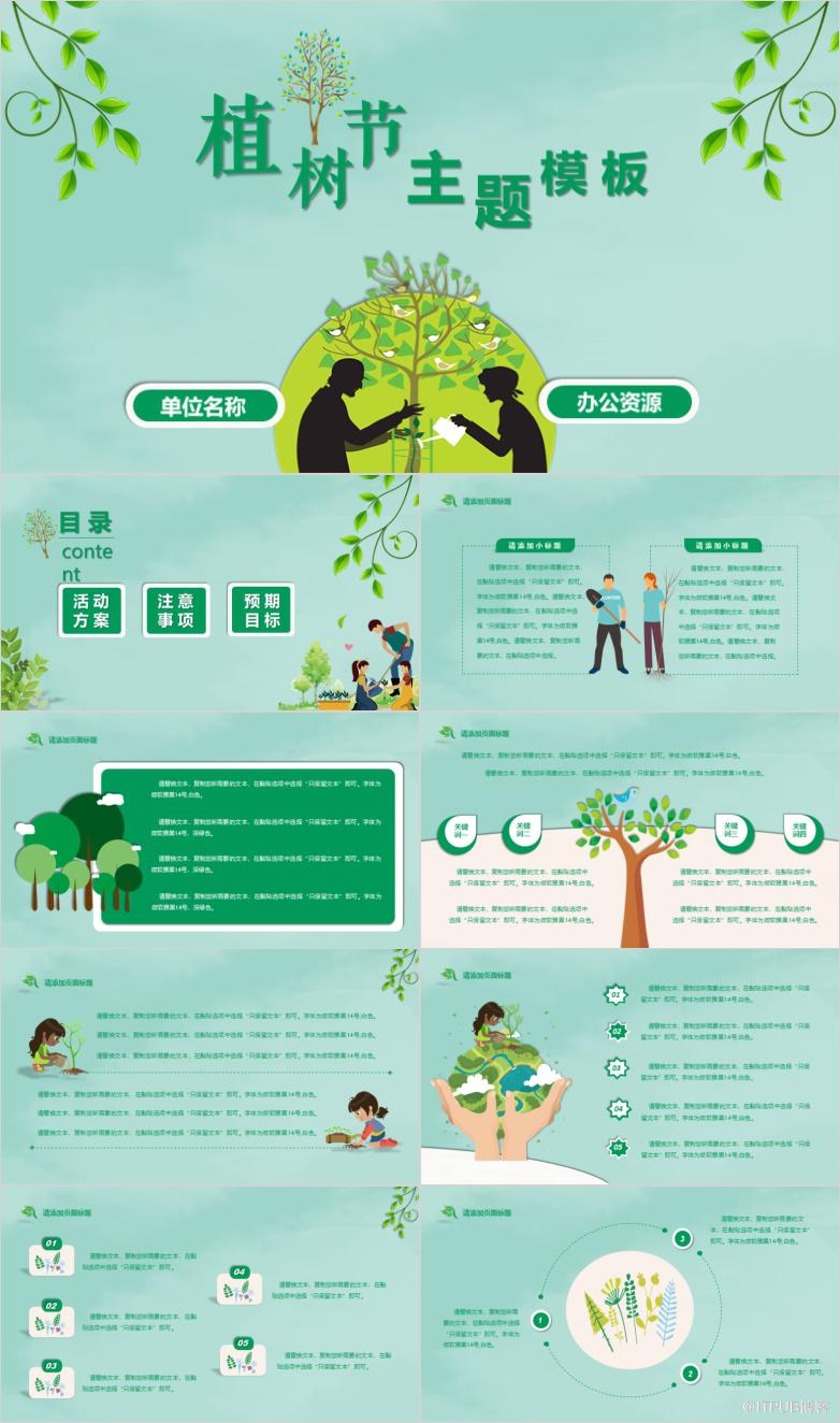 办公资源打造精美PPT模板,该模板是绿色植树造林卡通植树节PPT模板,可用于植树造林环保演讲展示,文字图片可直接替换修改,操作简单方便,您需要的更多精美ppt模板下载尽在办公资源网.