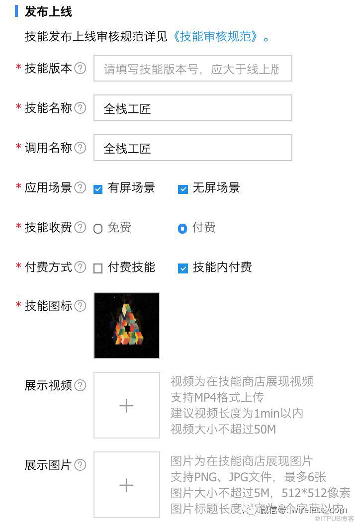 如果自己验证没问题了,就可以将仅能发布上线。就像AppStore 那样,发布上线需要关于技能服务的更详细信息,例如技能的图标,简介,版本号等。