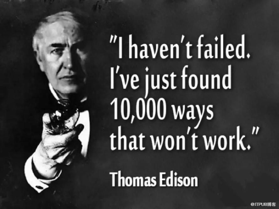 托马斯·爱迪生声称在发明灯泡的过程中测试了1000根灯丝。当一位记者问他:”失败1000次是什么感受?“他回答说:”我没有失败1000次。灯泡是一项有1000个步骤的发明。”