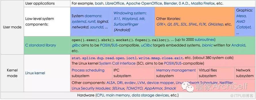 Linux 将内存划分为容易处理的内存页,提供了对 4KB 缓冲区的抽象,例如 slab 分配器。进程实际是某特定应用程序的一个运行实体,进程调度来控制进程对CPU的访问。Linux 中常见的进程间通讯机制有信号、管道、共享内存、信号量和套接字等。 内核通过 SCI 提供了一个API来创建一个新进程(fork、exec 或 POSⅨ),停止进程(kill、exit),并在它们之间进行通信和同步(signal 或者 POSⅨ 机制)。Linux 操作系统将独立的文件系统组合成了一个层次化的树形结构,并且由一个单独的实体代表这一文件系统。由于 Linux 支持许多不同的文件系统,并且将它们组织成了一个统一的虚拟文件系统.设备驱动程序提供一组操作系统可理解的抽象接口完成和操作系统之间的交互,而与硬件相关的具体操作细节由设备驱动程序完成。Linux内核的网络部分由BSD套接字、网络协议层和网络设备驱动程序组成。 网络设备驱动程序负责与硬件设备通讯,每一种可能的硬件设备都有相应的设备驱动程序。