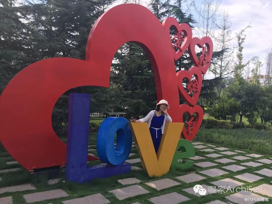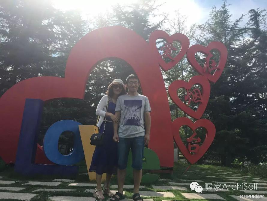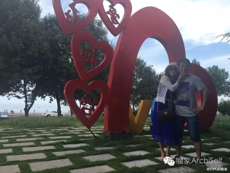 妻是个有心的人,在来途发现了一个妙景。 我们从烟台大学出来后,特意来到了莱山区政府附近的一座小山上,红色的心形旁挂着四个字——Love,爱在烟台。