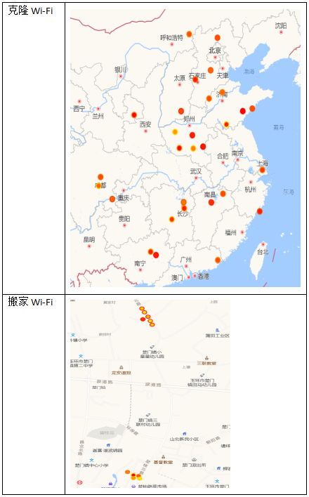 针 对WiFi而言,移动WiFi、克隆WiFi、搬家WiFi等都可能造成AP位置的错误。移动WiFi包含手机热点,4g移动路由器,公交车/地铁/高铁上的WiFi热点等,这些WiFi的移动属性较强,位置频繁变化,如下图所示。
