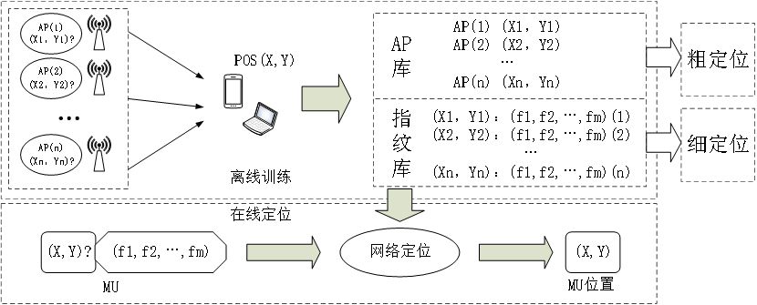 离线训练: 是 在 用户 有 GPS位置 时 采集 周边 的WiFi和基 站( 以下统称 为 AP) 信息 ,通过对 采集数据进行 聚类和关联,得到 两 类 数据产品: AP库和 指纹库;