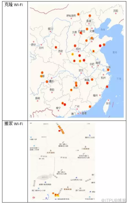针对WiFi而言,移动WiFi、克隆WiFi、搬家WiFi等都可能造成AP位置的错误。移动WiFi包含手机热点,4g移动路由器,公交车/地铁/高铁上的WiFi热点等,这些WiFi的移动属性较强,位置频繁变化,如下图所示。