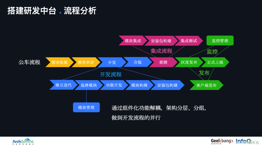 研发中台建设根据当前的公车流程,结合组件化方案进行细分,制定了新的产、研、测、项详细流程,并将流程中台化,降低了风险、提高了效率、实现了研发并行。