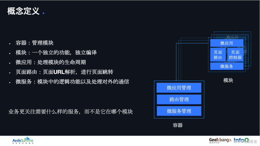 组件化参考了手淘Atlas、BeeHive和网易LDBusMediator等成熟的容器方案并融合了高德自身的业务特点和设计思考,定义了容器、模块、微应用、微服务和页面路由。借鉴了Android组件化设计思想,让业务专注于自身需要的服务,而无需关注其它。