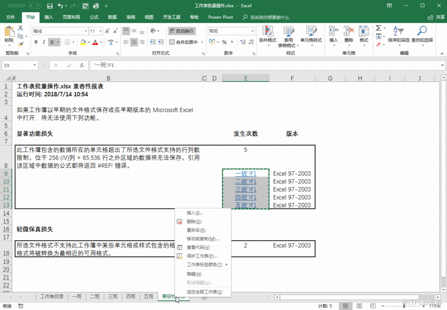 在兼容性报表里面我们可以看到只要超出了2003版本中没有的功能就会检查出来,并显示工作表名称。