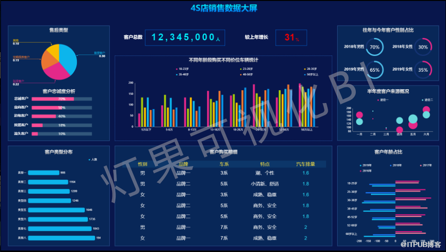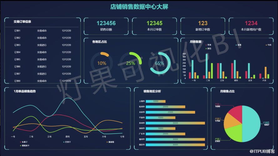 BI 除了通过动态表展现数据外,还可通过丰富多彩的图形去展现,并且能对图形做拉伸、分块、旋转、透视等多种处理,以更直观可见的方式来展现数据规律。同时还可对数据做各种标识。如特别好的销售数据用绿色表示,特别差的销售数据用红色表示。另外,还可对数据进行跟踪分析。 如下图用商业智能数据分析出来的大屏界面: