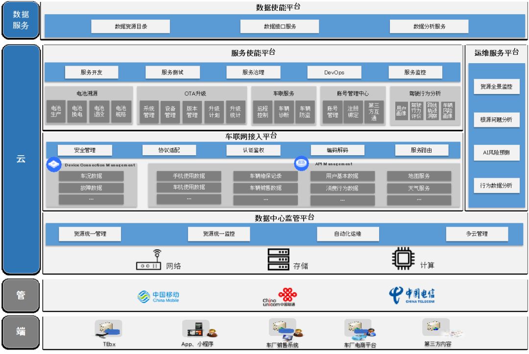 第四阶段(2018 年至今),整车厂将众多第三方合作伙伴共同搭建内容和服务整合到车端,利用运营商的网络管道,通过智能网联云平台实现“云、管、端”的服务模式。