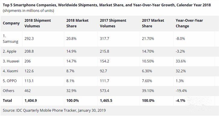 生活上的便捷让越来越多的人选择使用智能手机,年初,IDC 发布的 2018 全年全球智能手机出货量数据显示,2018 年三星手机出货量仍然是第一位,出货量为 2.923 亿台,市场份额为 20.8%,年同比下跌 8%;苹果手机出货量为 2.088 亿台,市场份额为 14.9%,年同比下跌 3.2%;华为手机出货量为 2.06 亿台,市场份额为 14.7%,年同比增长 33.6%;小米、OPPO 手机出货量分别位列第四、第五位。