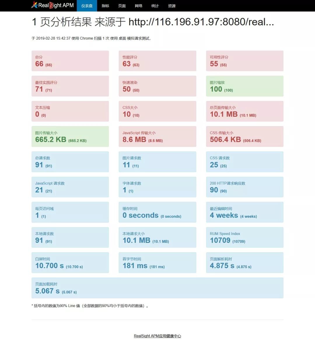 应用健康中心监控页面渲染全过程,记录渲染过程中的计时指标,如白屏时间、DOM 渲染时间、用户可操作时间等;资源加载如每页请求数、每页请求大小等;同时根据专家知识库的运维经验,对渲染过程从性能、可用性、最佳实践角度进行评分,帮助客户了解应用性能状态,掌握用户访问真实感受。