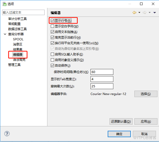 ②这时我们需要设置显示行号,在“窗口—选项—查询分析器—编辑器”中勾选显示行号,点击“确定”即可完成。