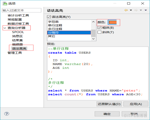 ③选择“查询分析器—语法高亮—分隔符”即可对其设置颜色及字体类型,在预览中就可以看到颜色的变化了。