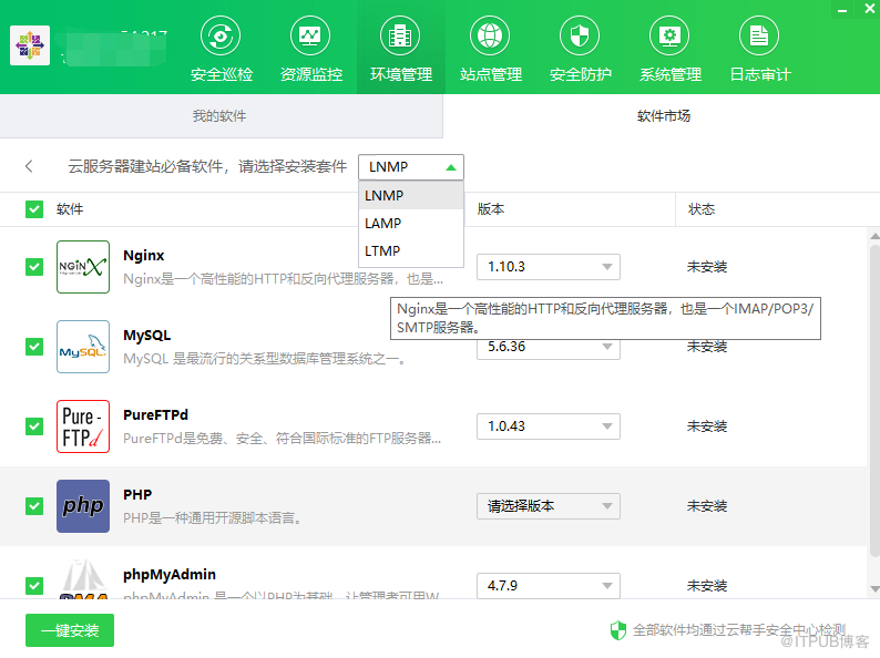 有LNMP、LAMP、LTMP三种不同的环境套件,你根据自己的需要选择一键安装或单独安装。
