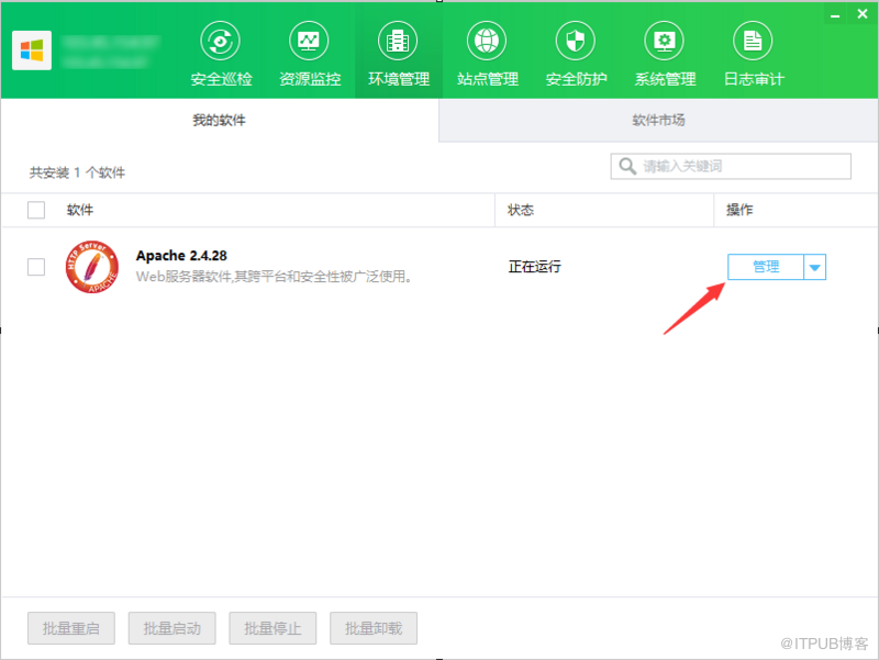 首先在添加了自己的服务器之后,就可以进行环境部署了,打开环境管理页面,这里会提示你需要先安装软件,才能进行管理。点击进入软件市场。