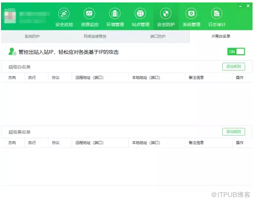 宝塔关于安全防护的内容只有IP黑白名单的设置,相比之下云帮手这方面会比较完善一点,分别有系统防护、网络连接管控、端口防护和IP黑白名单几个功能,对服务器的防护会更全面一些。
