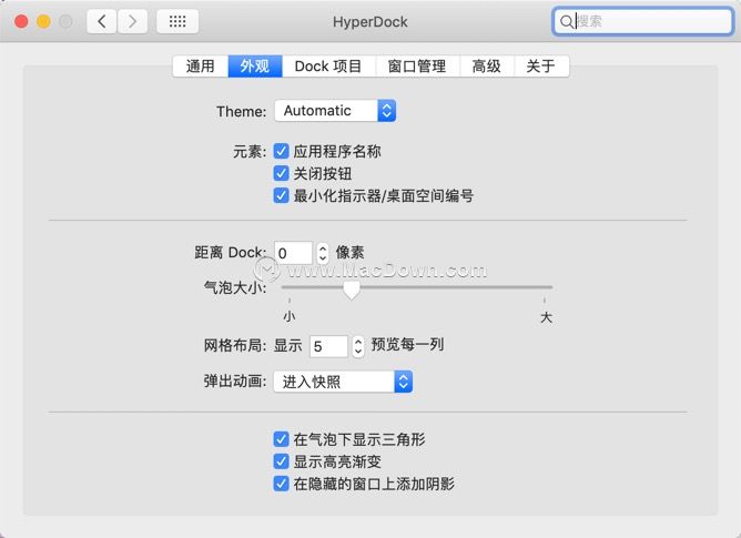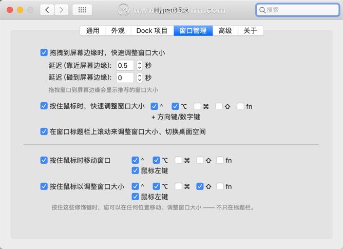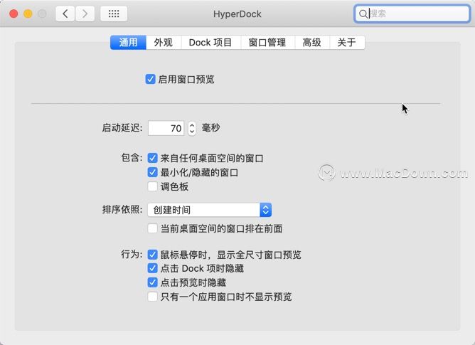 HyperDock 提供相当丰富的设置,用户可以设置窗口预览大小、快捷关闭按钮、Space设置等。