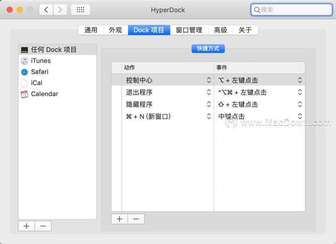 为停靠项目分配键和鼠标快捷键以隐藏或退出应用程序,启动Expose,打开Safari选项卡,Finder Windows等等。