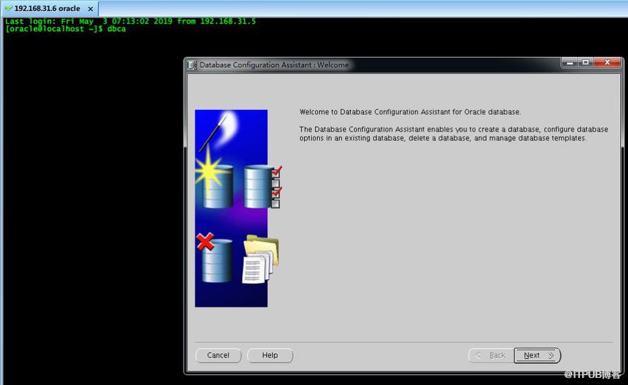 1、打开Xmanager-Passive,然后用oracle用户登录数据库服务器SSH后台后输入dbca,启动图形化数据库创建向导界面