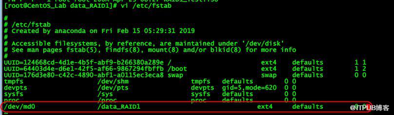 最后一行加入/dev/md0 /data_RAID1 ext4 defaults 0 0