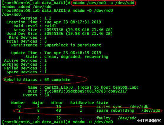 完成重建后移除故障盘mdadm /dev/md0 -r /dev/sdc