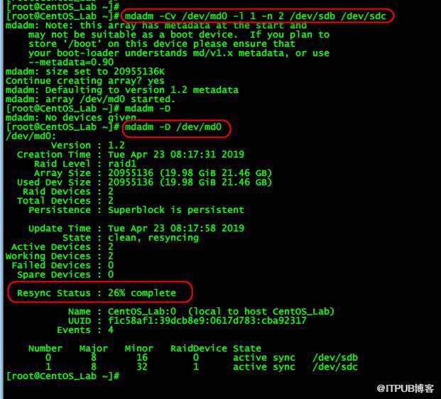 可以看见创建后RAID1的两块盘正在同步状态