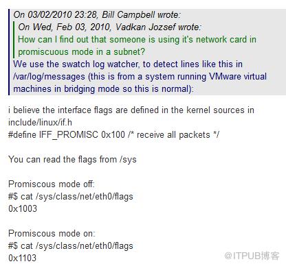 实际上,网卡是否处于PROMISC模式,ifconfig并不是最直接的判断依据,换句话说就是ifconfig能看到PROMISC标记表示一定处于混杂模式,但处于混杂模式并不一定能看到PROMISC标记。内核判断网卡是否处于混杂模式是看/sys/class/net/eth0/flags的值,如果置位了0x100,则处于混杂模式