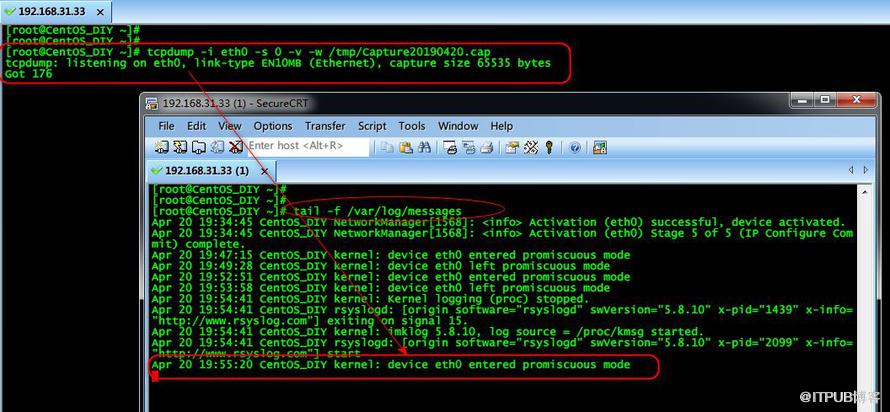 如下图,开启tcpdump抓包后,在新窗口克隆会话tail -f /var/log/messages可以看到系统日志