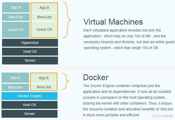 Docker 和传统虚拟化方式的不同之处,可见容器是在操作系统层面上实现虚拟化,直接复用本地主机的操作系统,而传统方式则是在硬件层面实现