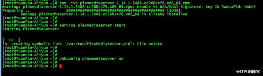 2、在阿里云ECS主机上进行rpm -ivh 安装,安装完成后并启动plexmediaserver服务,设置为开机自启动