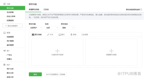 当我们搭建了的公众号,也运作了一段时间,这时候我们得学会看数据分析,数据分析能够帮助我们去做一些改进建议。比如现在我们每天推送的图文消息,究竟有多人浏览了。有多少人转发。就可以通过看数据分析来进行优化。另外就是这个自定义菜单,我们设置了自定义菜单之后,这个自定义菜单究竟每天有多少人点击?哪个菜单用户比较喜欢,哪个菜单又不喜欢,也可以配合数据分析来做优化。另外还可以帮助我们去统一收入降低其中的成本。