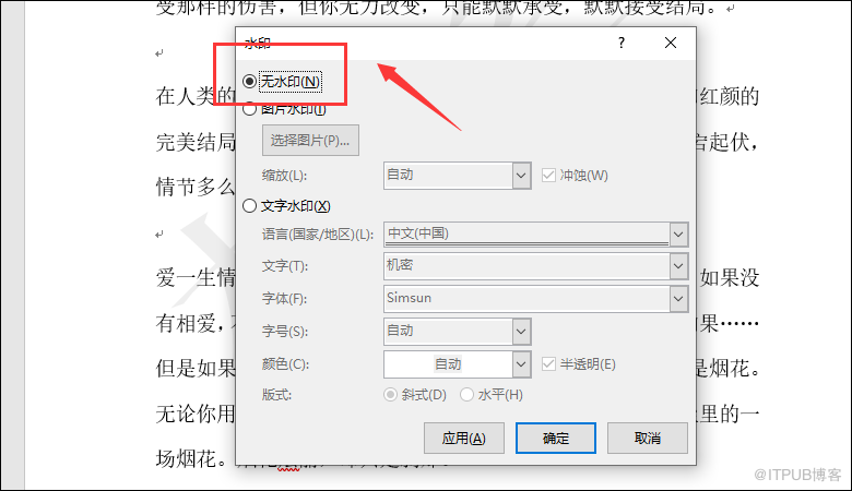 其实自定义模式和直接去除水印的方法是有些相似的,都是在【设计】的选项卡中选择【页面背景】版块,不过不同的就是点击一下【水印】中的【自定义水印】,然后弹出自定义水印的功能框,选中一下【无水印】,再点击确定即可。