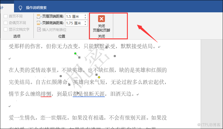 如果我们觉得水印太大的话,可以在双击页眉后,点击带水印的地方调整水印大小,最后点击关闭页眉页脚就搞定了。