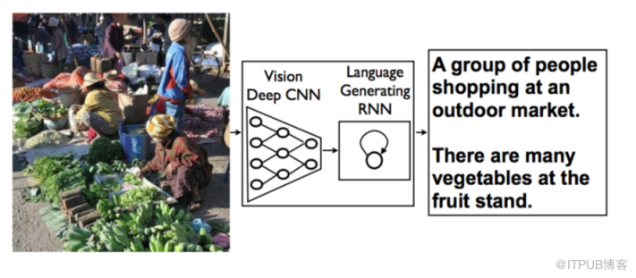 譬如,像这种给模型输入一张图片(左侧),让它输出一段话(右侧)来描述图片上的信息的应用。这是一种比较复合型的人工智能应用,既有CV的基础技术作为支持,也绝少不了NLP的技术作为支持。