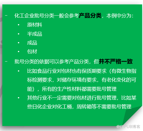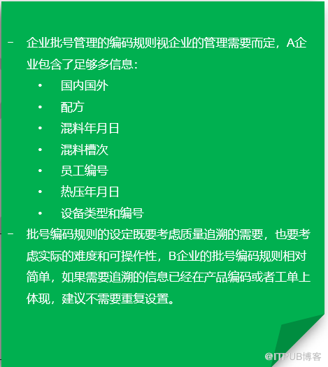 - 化工行业的批号一般都会喷涂在外包装或者货品上,日化品一般直接喷在产品本身,比如香水、面霜、粉底液等等 - 体积有限,可喷涂面积有限,批号过长会影响实际操作 - 编码过长,含义过多,对一线操作人员要求比较高 - 有些企业批号只是质量追溯的依据,和批号相关联的更多的产品采购、投料、质检、发货信息都存储在 ERP 系统里 -