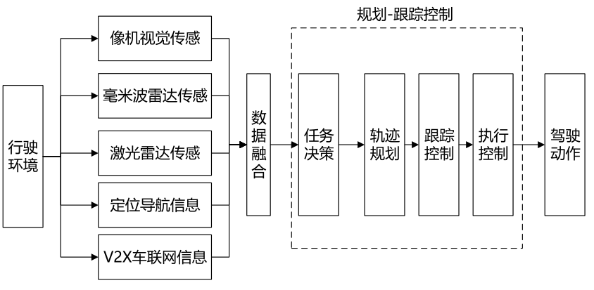 自动驾驶间接控制方案可以简单概括为,根据当前车辆行为需求,在满足车辆自身运动学和动力学约束条件下规划出一条空间上可行且时间上可控的无碰撞安全运动轨迹,然后设计适当的控制律跟踪生成的目标轨迹,从而实现自主驾驶。