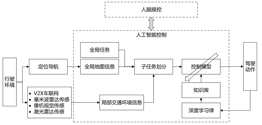 基于人工智能决策控制模型本质上是模拟人脑对外界环境信息和车体本身信息的感知,同时由驾驶经验并同在线学习机制来获得持续稳定输出的过程。