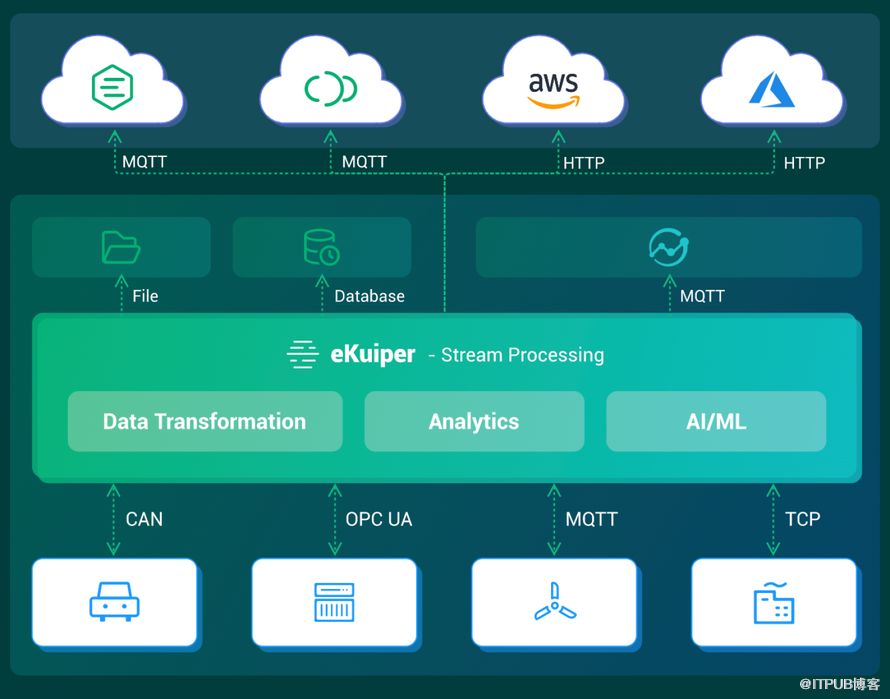 如下图所示,eKuiper 具备了数据流的接入、处理和流转能力。南向部分,eKuiper 支持接入各种协议的数据流,例如 CAN 总线、MQTT 协议、Socket(TCP 或 UDP)和 DDS 等。接入的数据可以在引擎内部根据用户定义的规则,进行数据的采集、转换、过滤和分析等数据处理工作,之后再将采集或处理的结果发送到各种北向的目的地中,例如存到本地的文件、数据库中以便后续车载应用使用;或是通过 HTTP/MQTT 等协议发送到云端或 TSP 应用端进行处理。