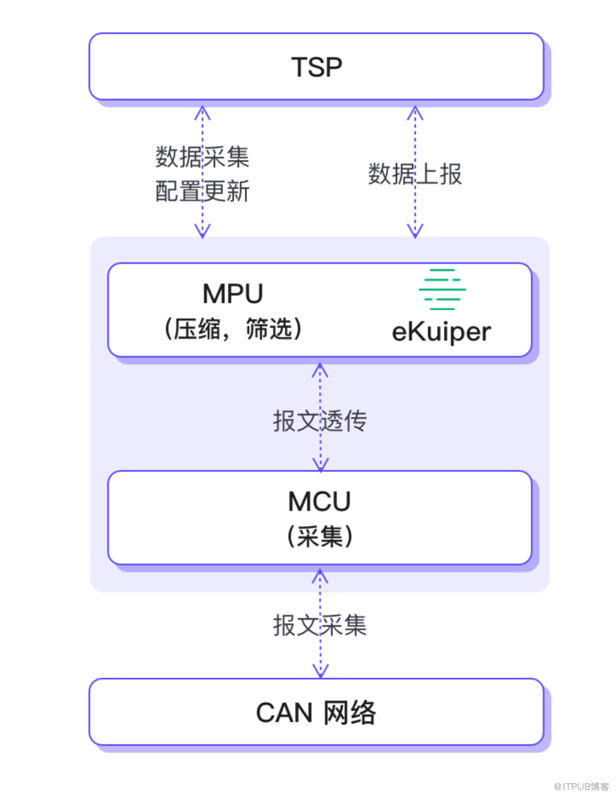 若 eKuiper 可以直接连接 CAN 总线,则可通过 CAN 协议建立到车载总线的连接,获取总线数据。出于安全的原因,eKuiper 也经常被部署到与总线隔离的硬件上。例如,eKuiper 部署在 MPU 中;而在 MCU 中部署 CAN 总线连接应用,通过 TCP、UDP 或者 MQTT 协议等,将报文透传出来。eKuiper 同样支持通过这些协议进行连接,获取总线数据报文。