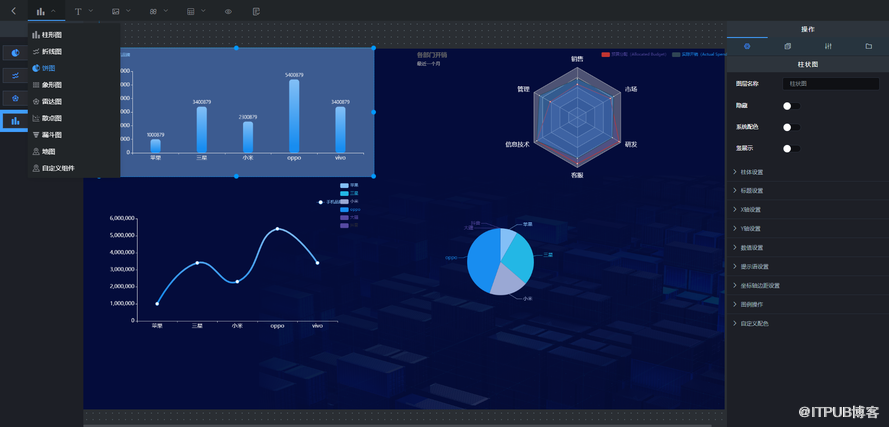 XJR 商业智能插件 是基于浏览器的、用于配置数据可视化大屏的工具平台。它提供了丰富的可视化设计组件,通过简单 鼠标 操作,即可进行图表布局的调整, 能在数分钟内 配置出 美观实用的BI系统 。